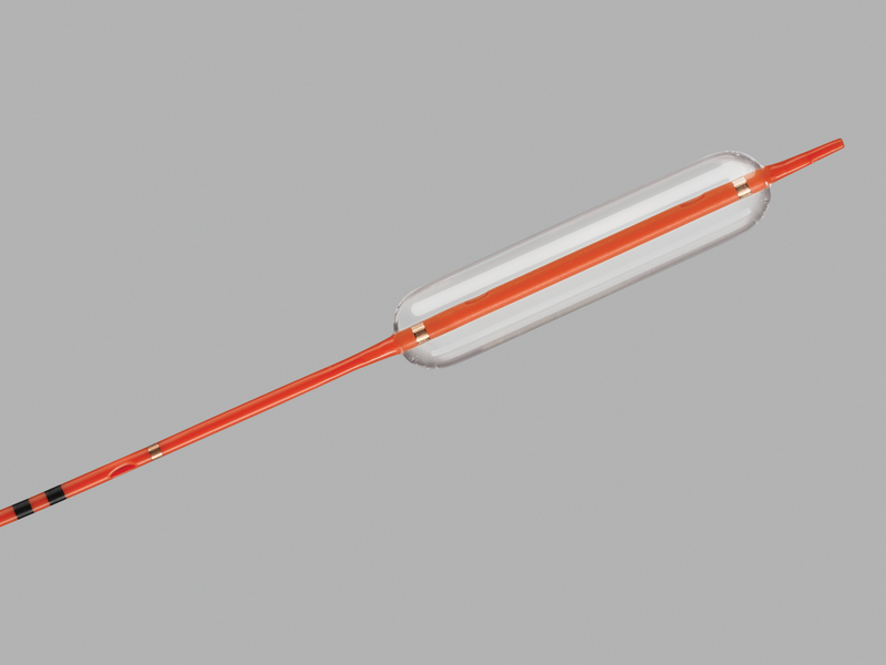 2) Multiport balloon catheter design allows for simultaneous anchoring during dilation. Low profile, minimally-compliant balloon material delivers expected therapeutic dilation outcomes. Catheter tag displays maximum balloon inflation pressure for added procedural convenience. Radiopaque bands located on either end of the balloon provide clear fluoroscopic visualization.
